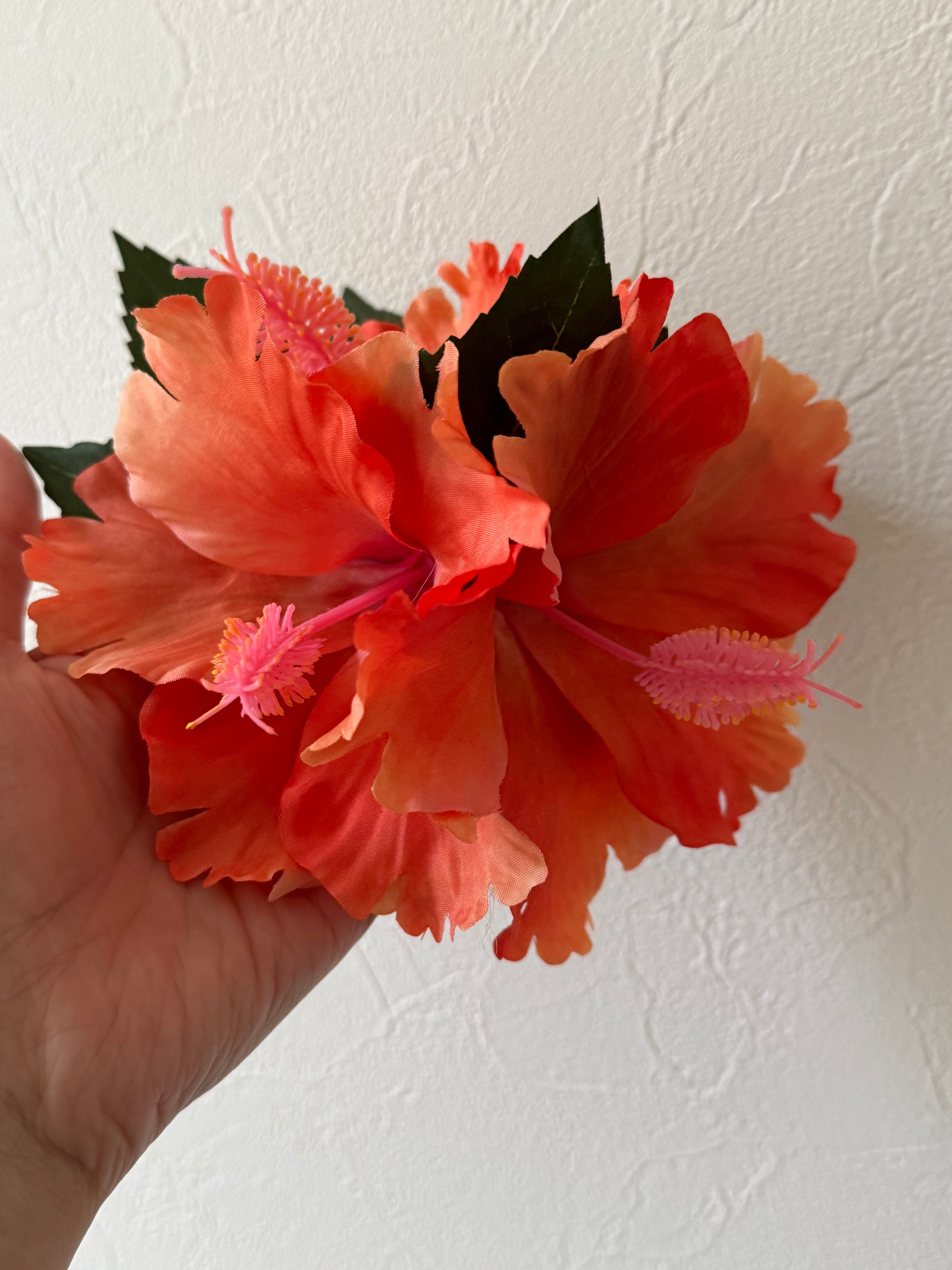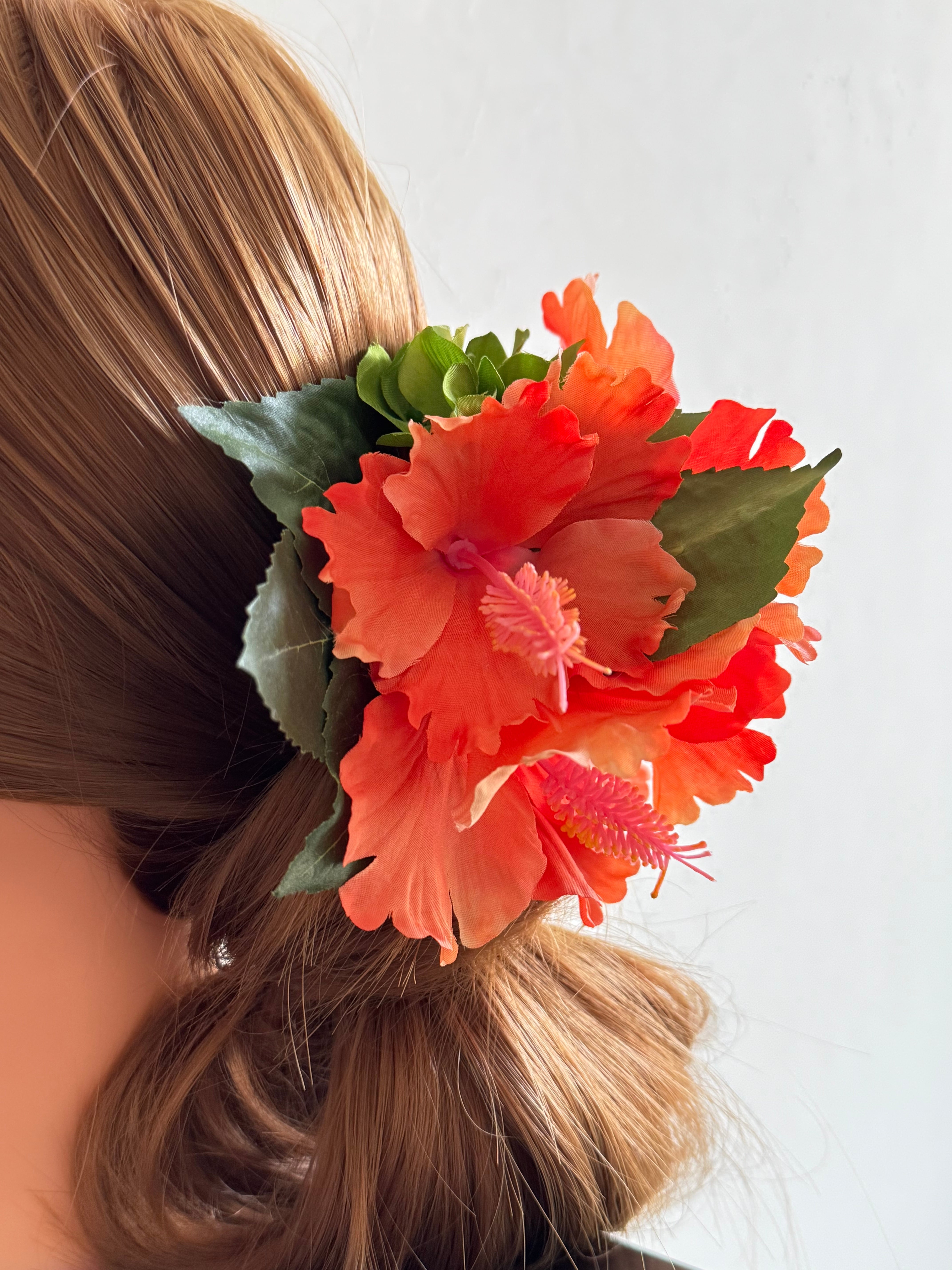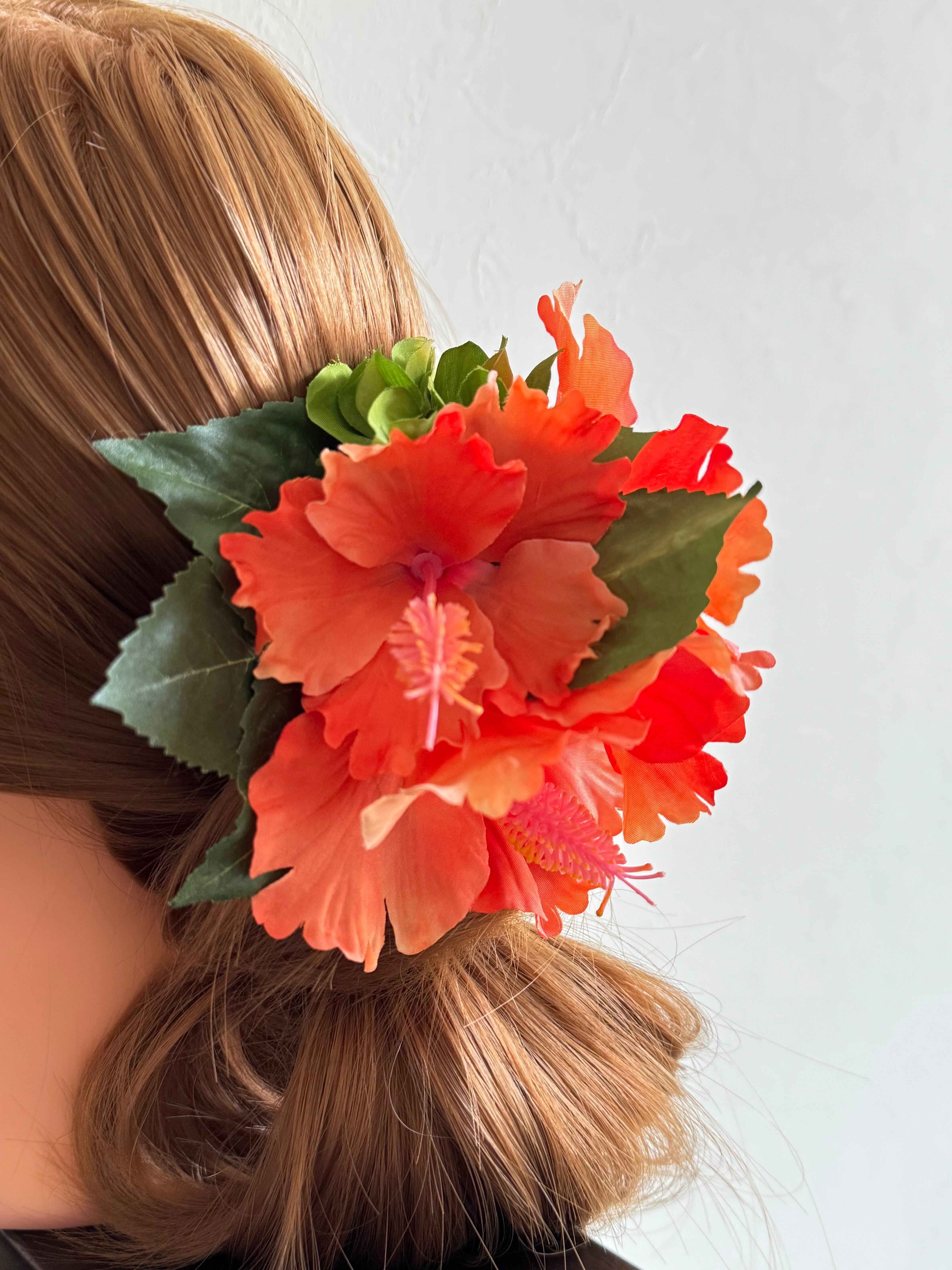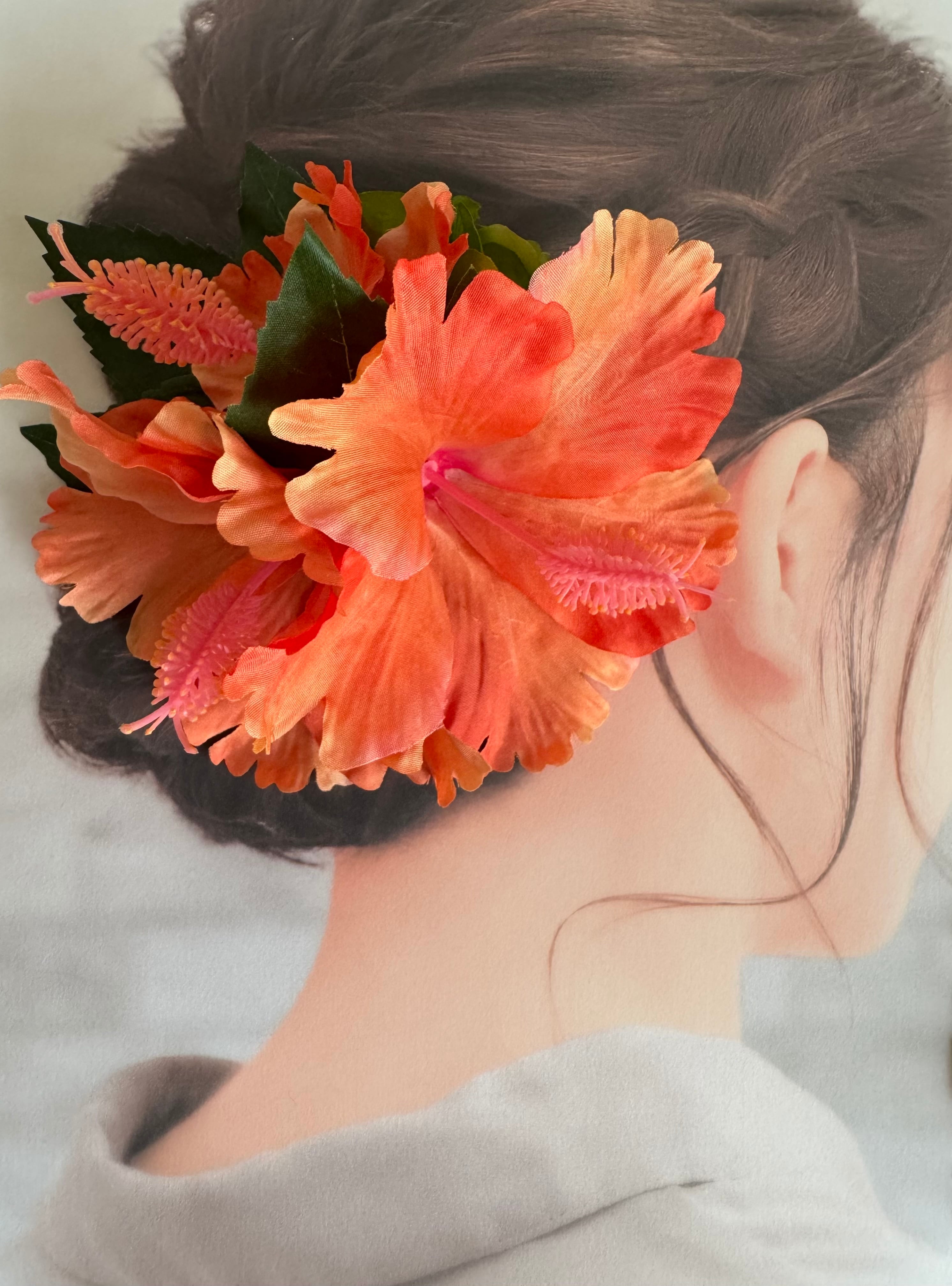 鮮やかなオレンジのハイビスカスが3輪並び、元気でHappyなフラの時間をさらに彩ります。