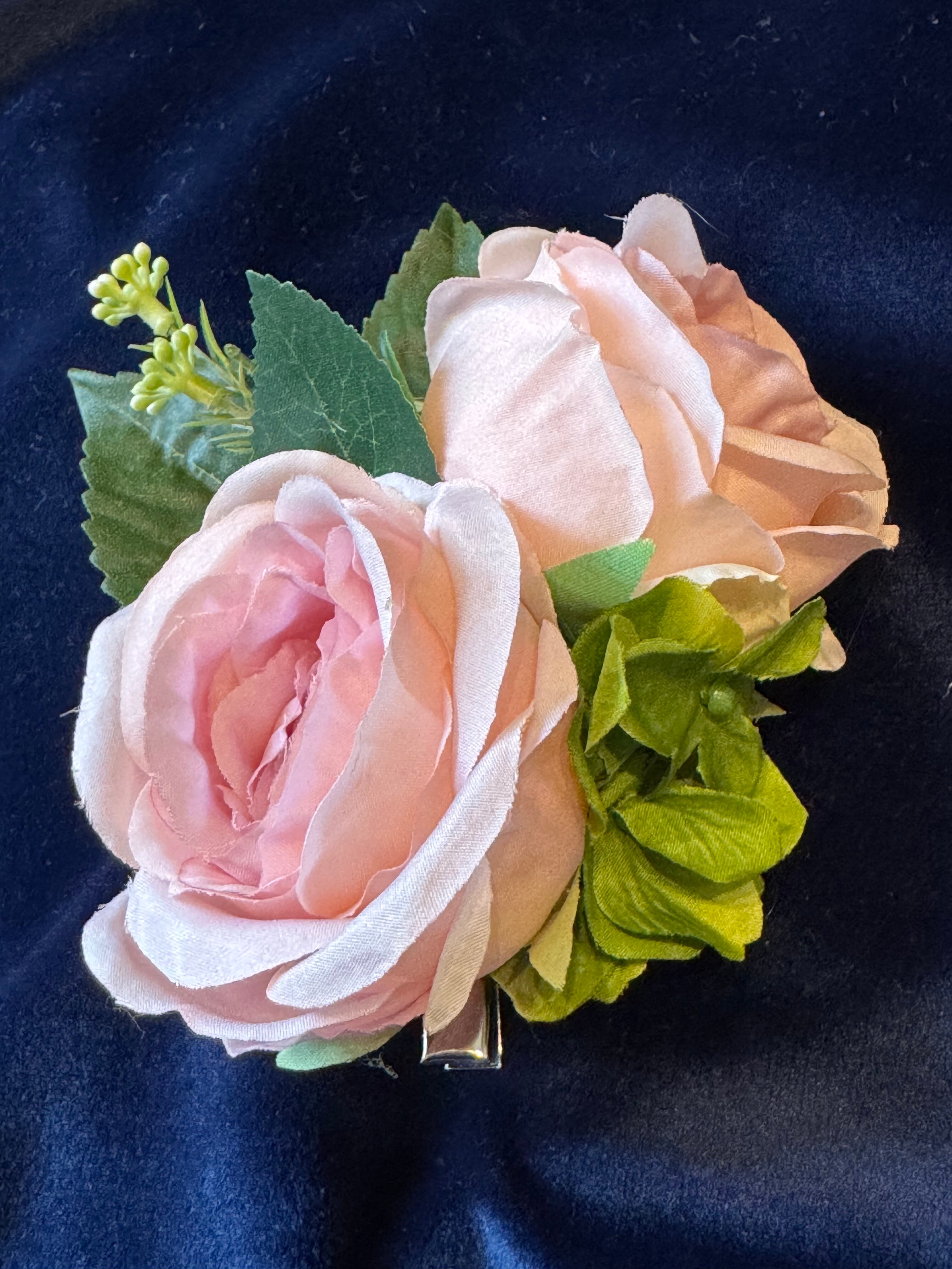 淡いピンクのローズを二輪あしらった、上品で華やかなアーティフィシャルフラワーのヘアクリップです。