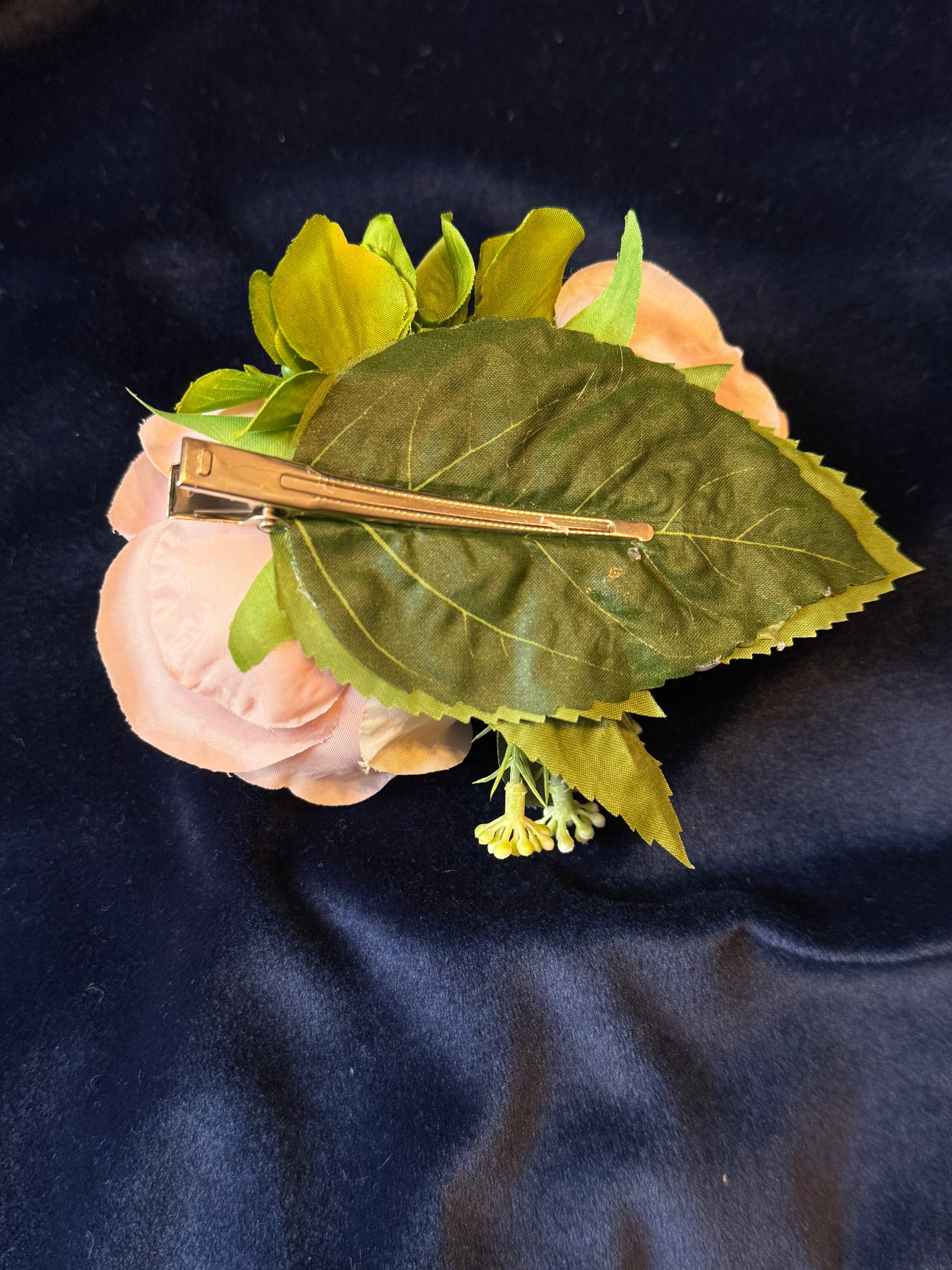 淡いピンクのローズを二輪あしらった、上品で華やかなアーティフィシャルフラワーのヘアクリップです。