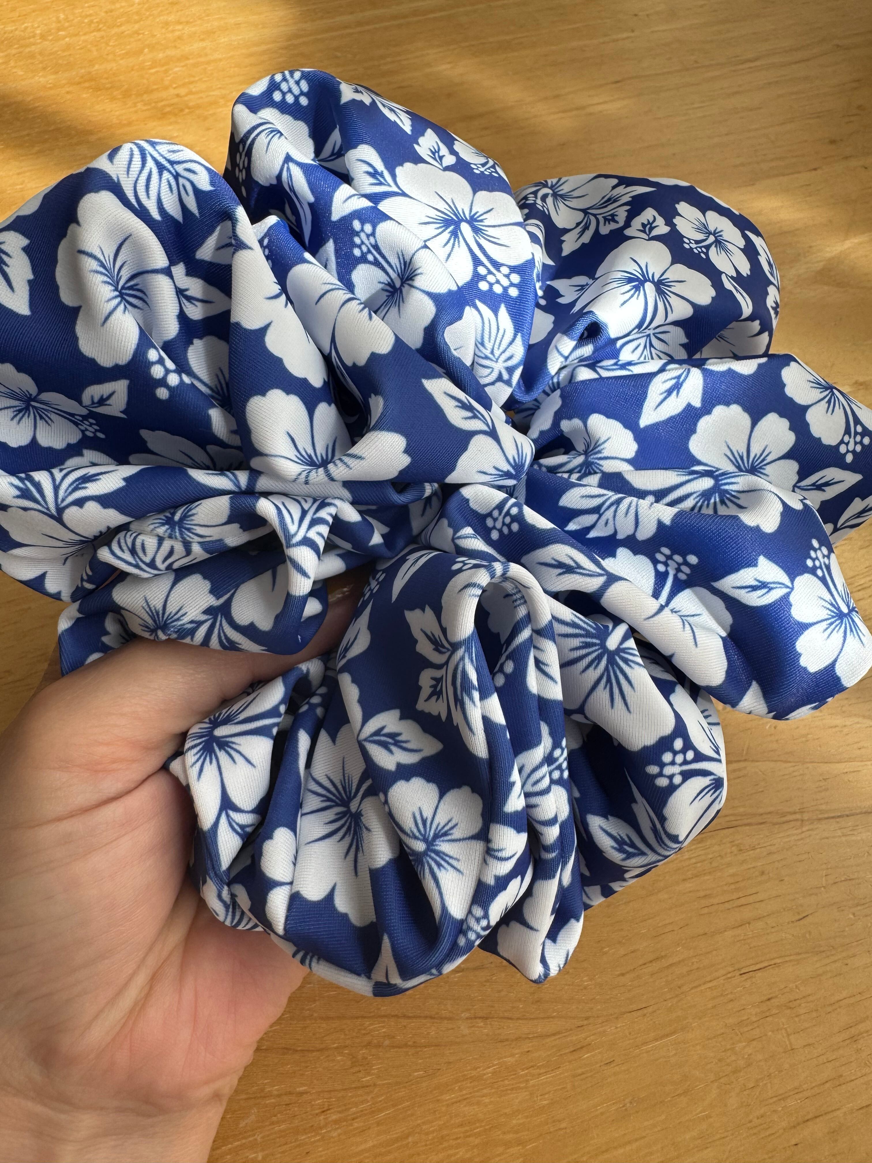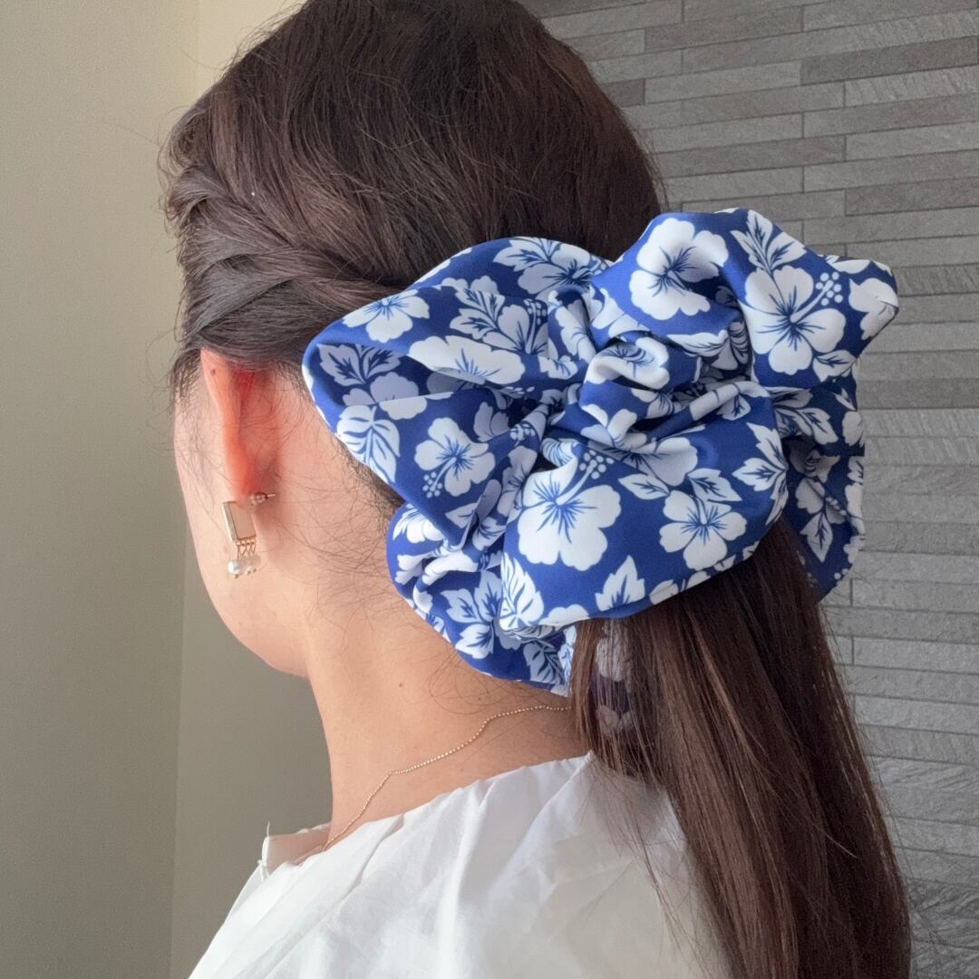白いハイビスカスが映えるネイビー地の生地で仕立てた、大きめサイズのシュシュです。
