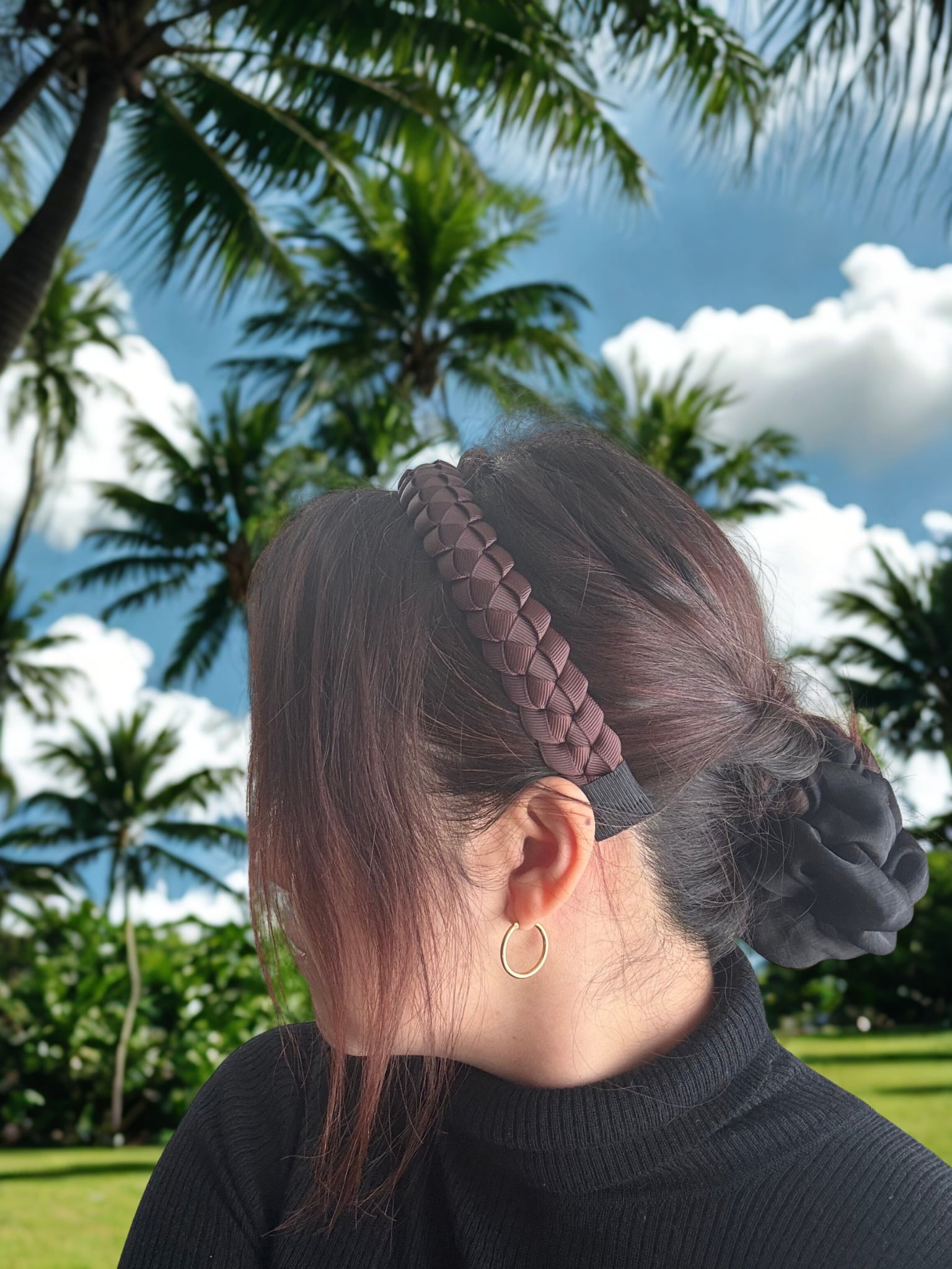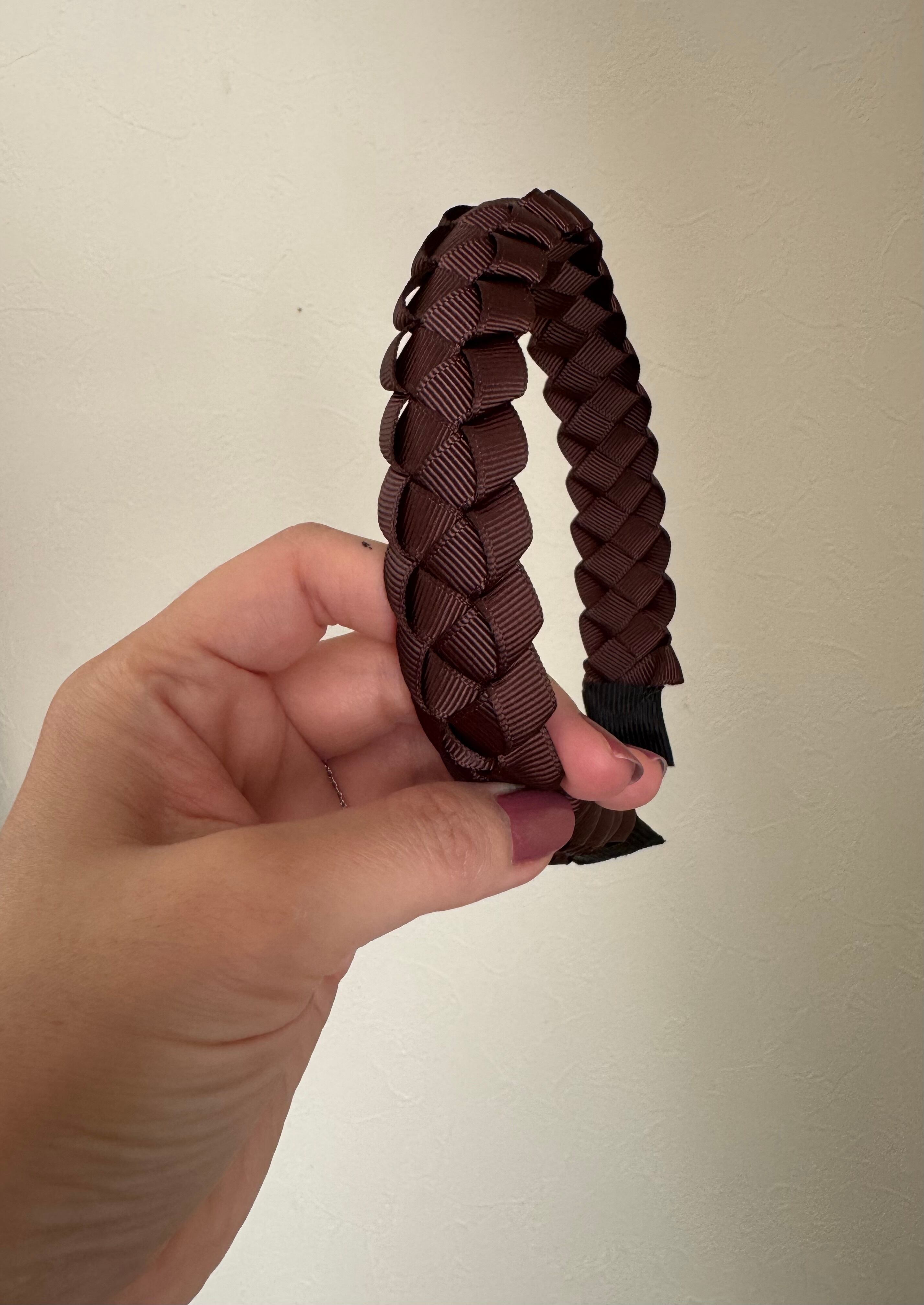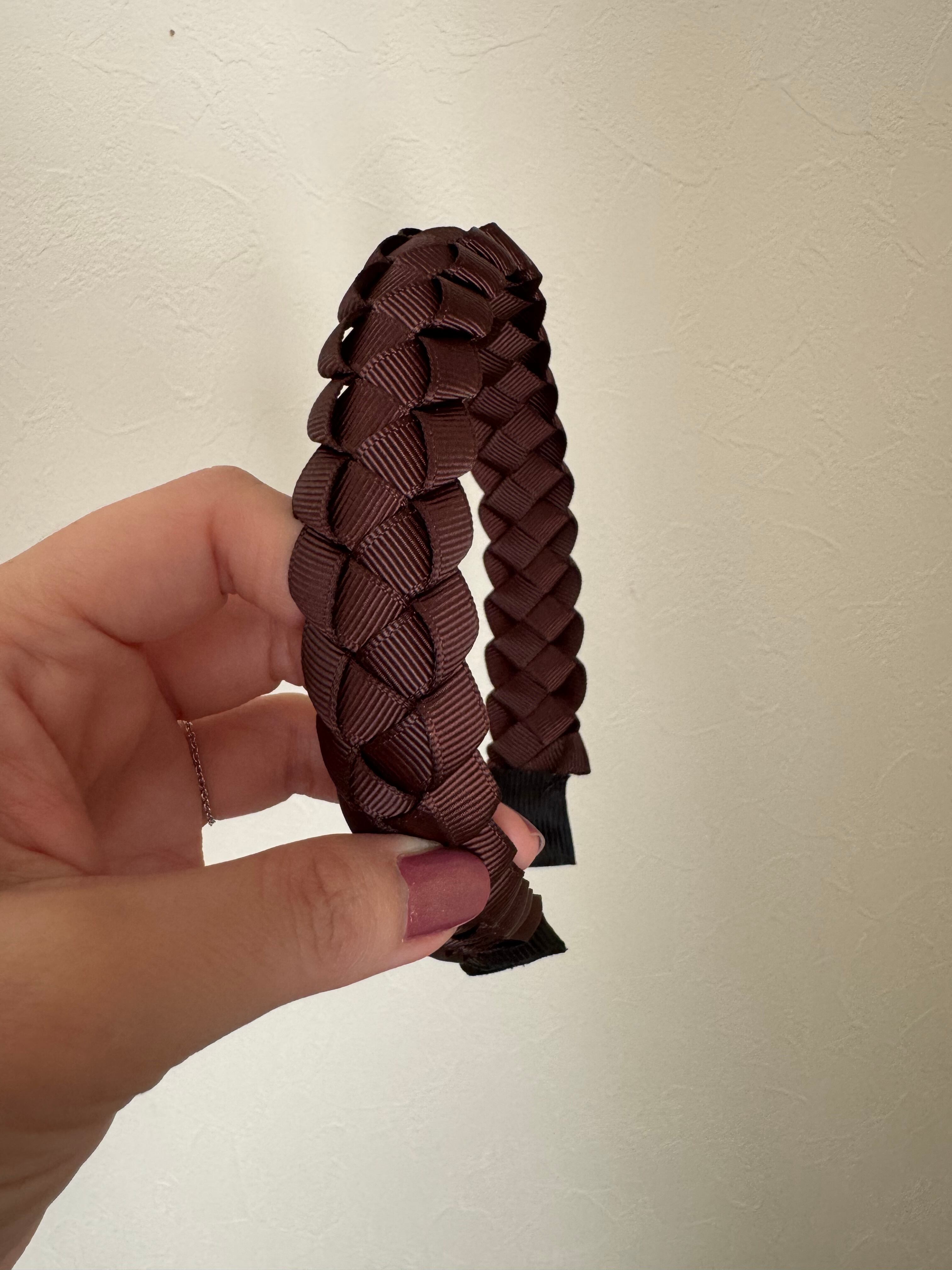 ブラウンのグログランリボンで丁寧に編み込み、カチューシャに仕立てました。